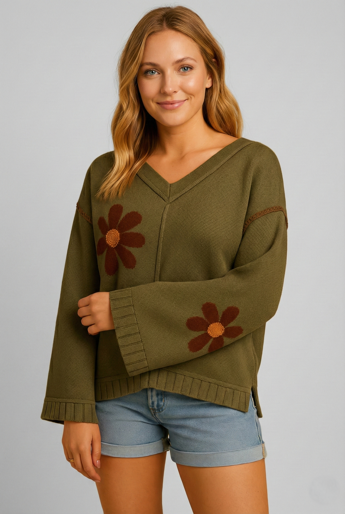 Ajoutez une touche joyeuse et chaleureuse à votre garde-robe avec Ralinde, un pull pour femme en V avec motif floral . La silhouette est contractée , les larges bras et les bords offrent un ajustement confortable avec une allure moderne. Grâce à votre tricot léger , ce pull est idéal pour les jours froids , que vous fréquenterez à l'école, que vous assisterez à une fête. Associez-le facilement à un jean, un legging ou un pull pour un look polyvalent et de caractère.